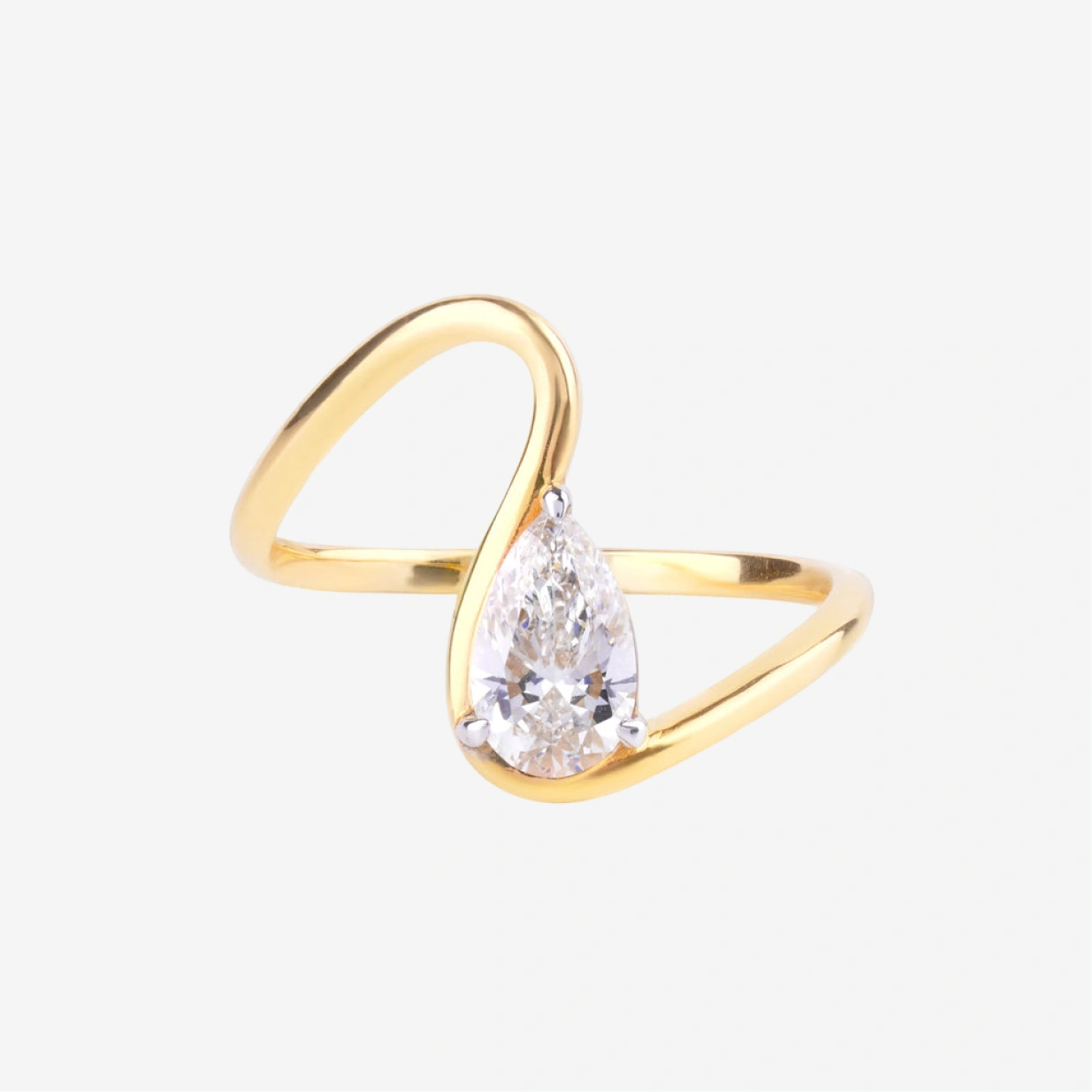 The 1ct Pear Diamond in Wave features a brilliant 1 carat pear-shaped diamond set in a fluid, wave-inspired 18K solid yellow gold band. With E/F color, VS1 clarity, and an excellent cut, this piece combines bold brilliance with an elegant, modern design. The wave setting enhances the diamond’s shape and sparkle, creating a captivating, timeless statement. Perfect for those seeking a unique yet sophisticated look.