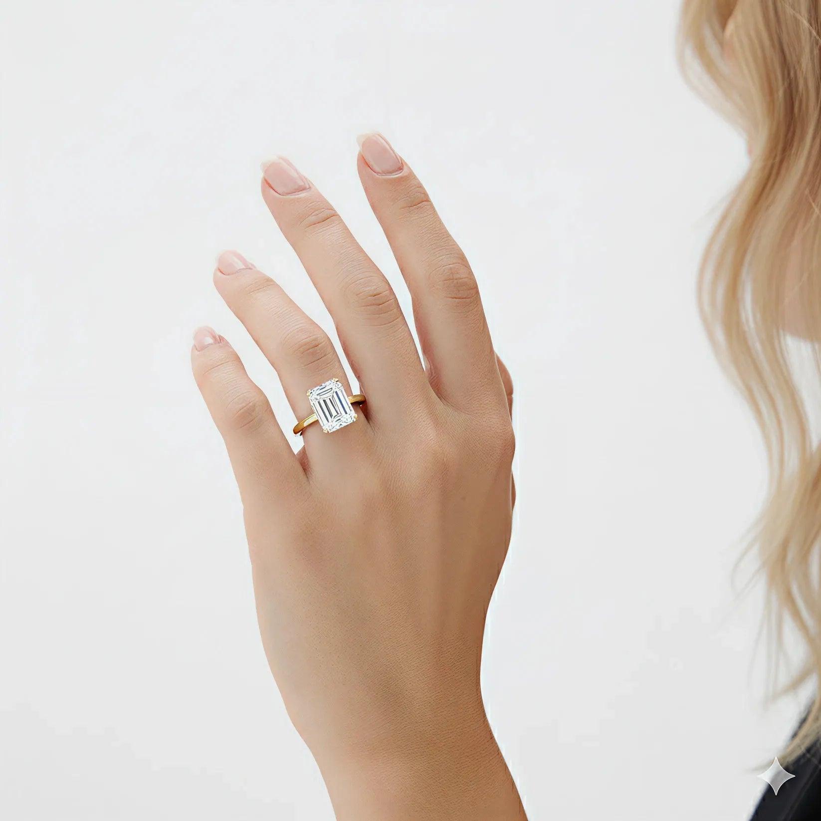The AL Classic Emerald Diamond Solitaire features a stunning emerald-cut diamond (4.25 cttw) set in a sleek 14K solid yellow gold basket setting. With F color, VS1 clarity, and an excellent cut, this piece highlights the diamond's refined lines and timeless brilliance. Celebrated for its sophisticated style, this solitaire makes a bold yet elegant statement, perfect for those seeking a classic and luxurious design.