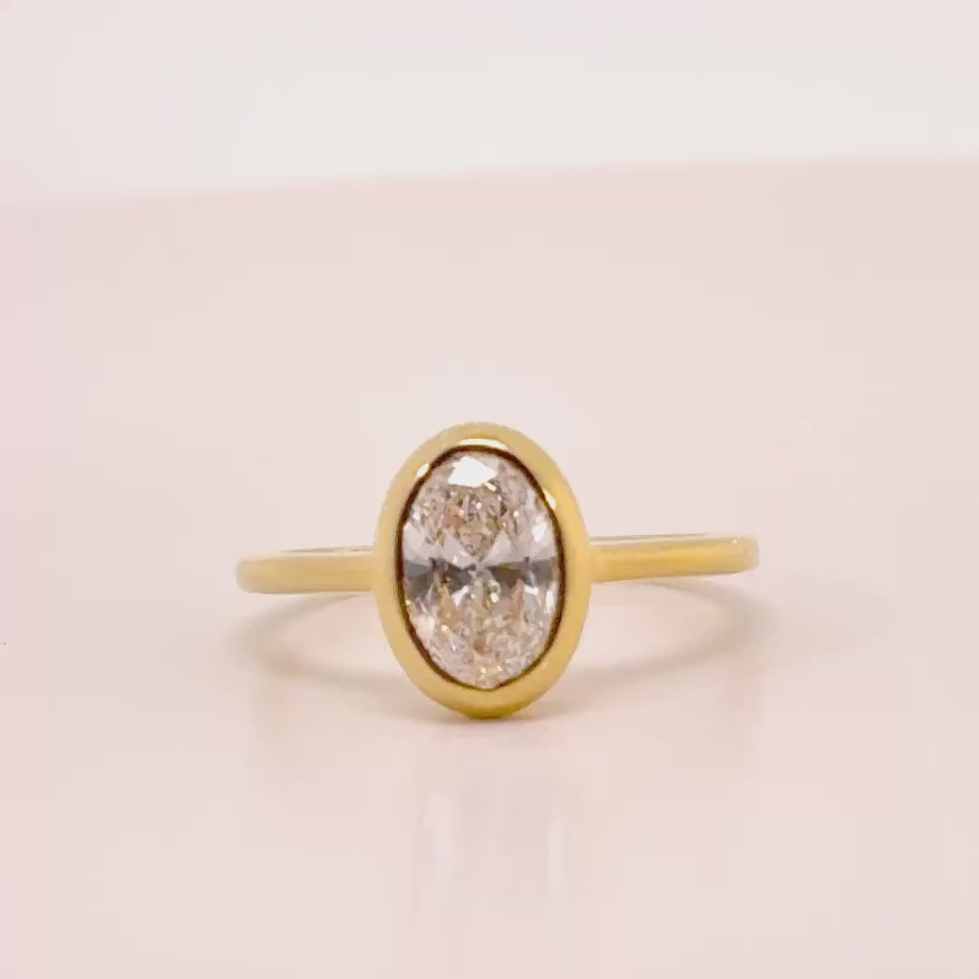 The Bezel Oval Diamond Solitaire features a stunning 2.08-carat oval diamond framed in a sleek bezel setting, offering a refined and contemporary look. Crafted in 14K solid yellow gold with D color, VS1 clarity, and an excellent cut, this piece enhances the diamond's unique shape and brilliance. Its minimalistic design makes it a perfect choice for those seeking elegance with modern appeal.