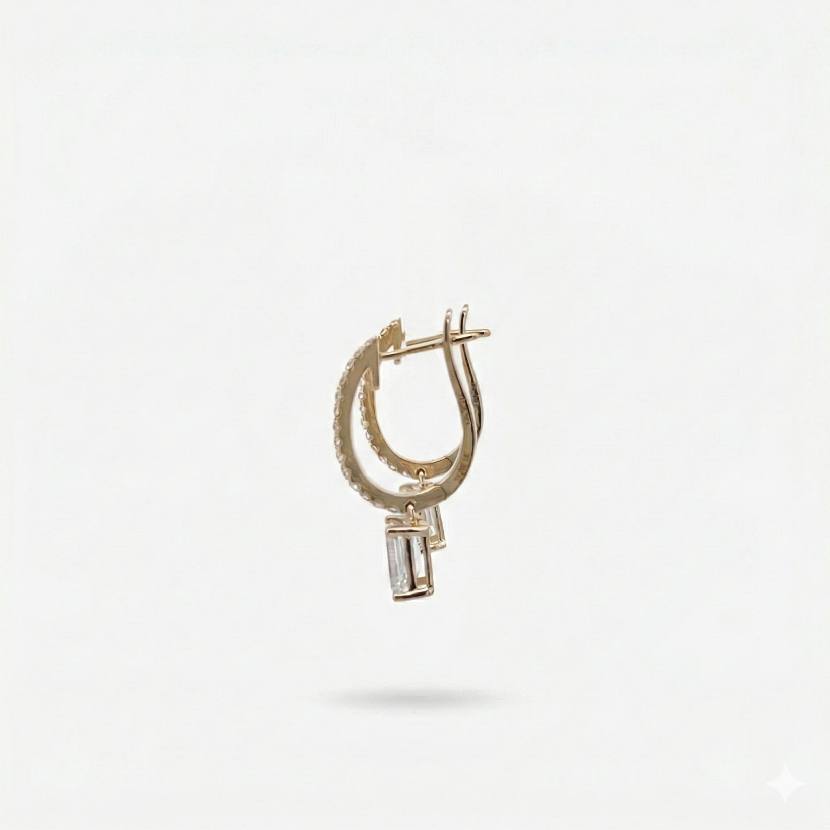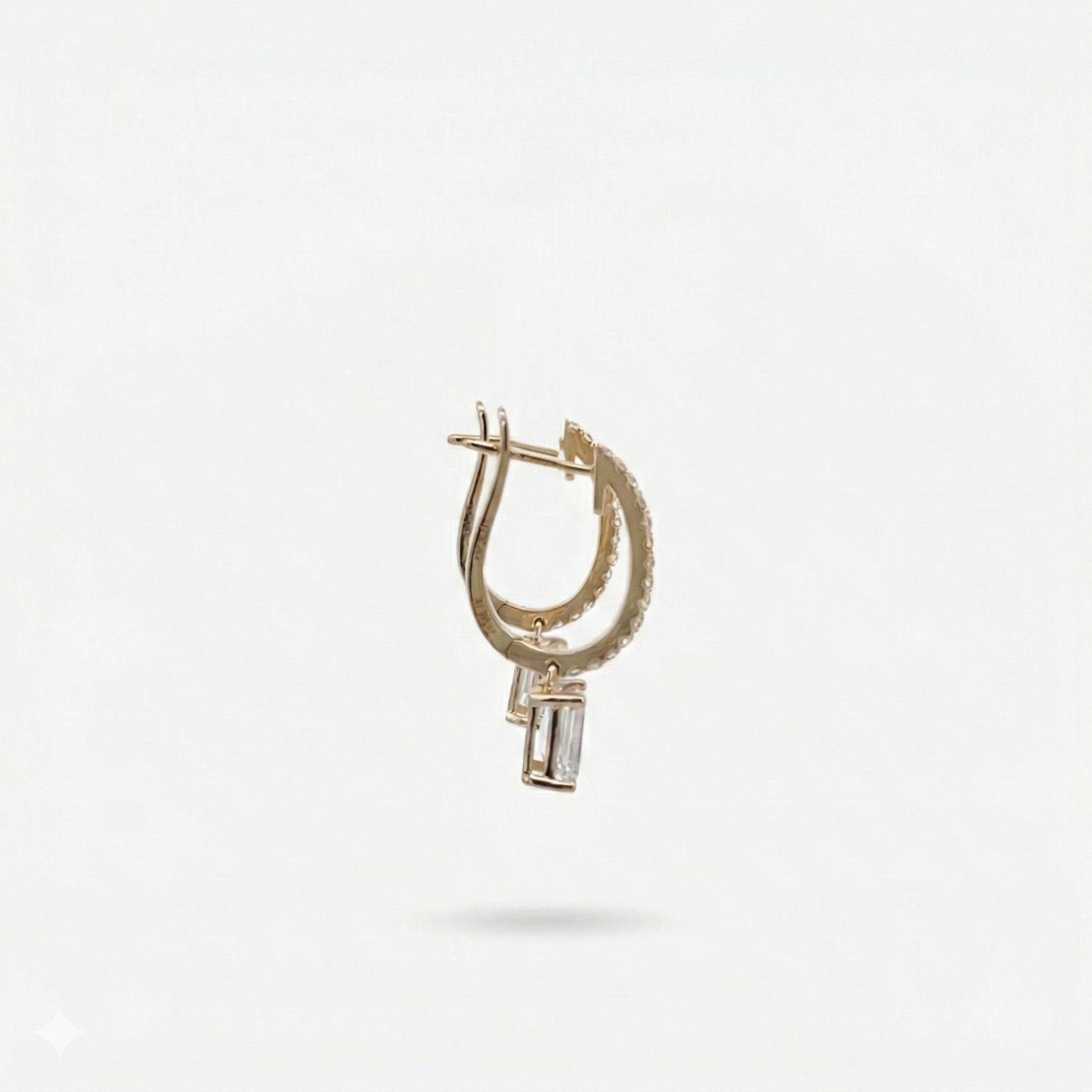 The Emerald Drop Earrings with Pave Hoops elevate a classic silhouette with added brilliance and dimension. Crafted in solid 14K yellow gold, each earring features an emerald-cut diamond secured in a refined four-prong basket setting, suspended from hoops adorned with pave-set diamonds. The pave detailing enhances sparkle from every angle, while the clean geometry of the emerald-cut diamonds provides a striking contrast of structure and light. Together, the combination creates a balanced interplay of angular reflection and refined elegance. Bold yet timeless, these earrings are designed to stand out, bringing radiant brilliance wherever they’re worn.